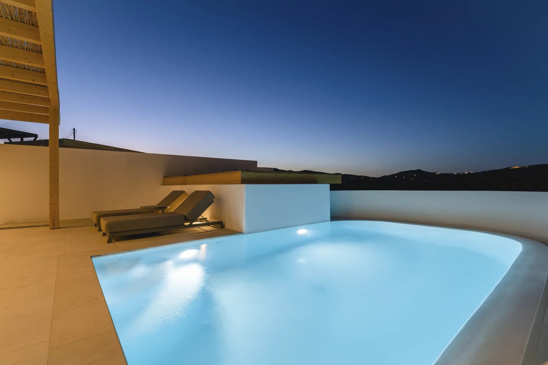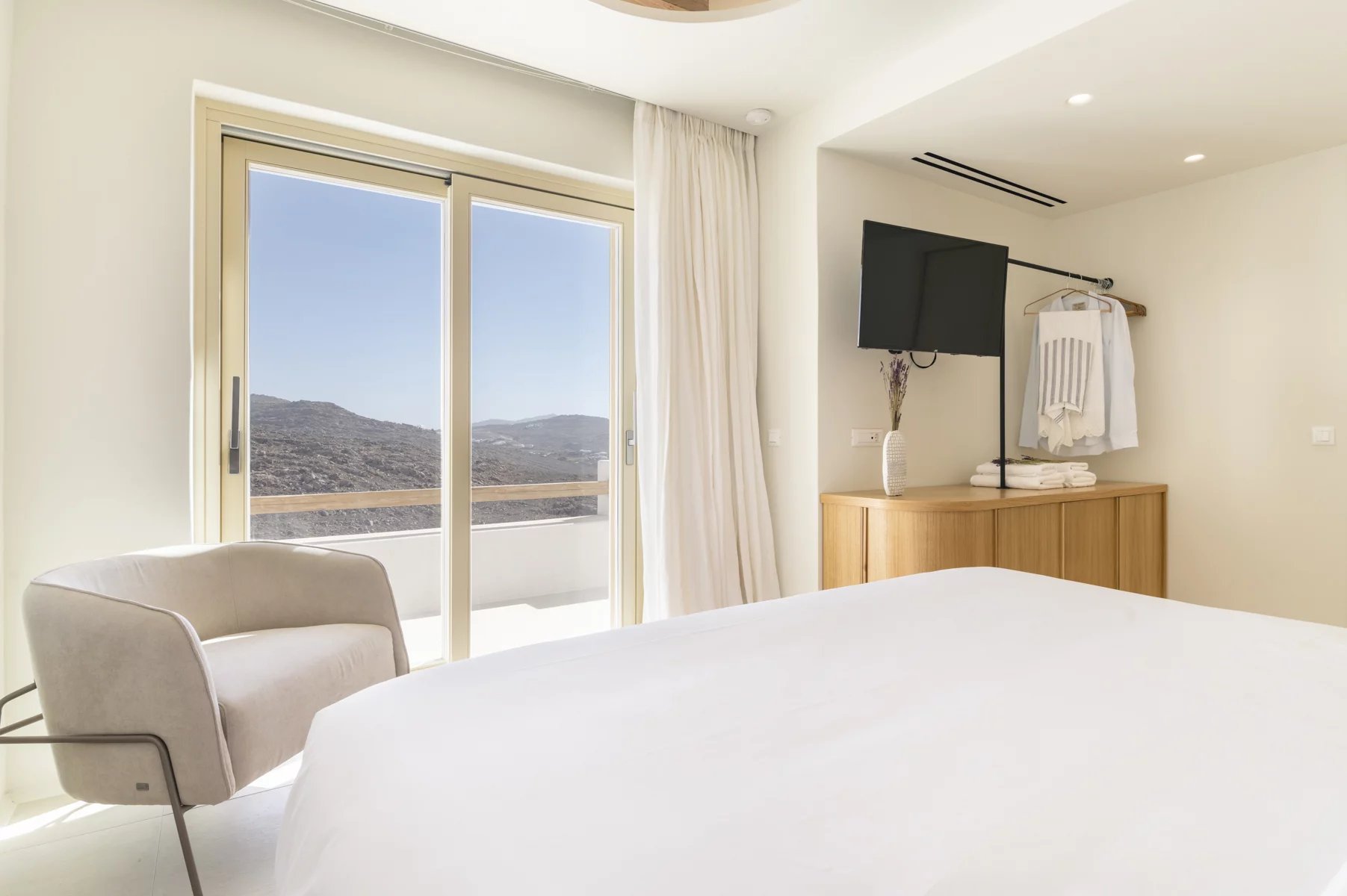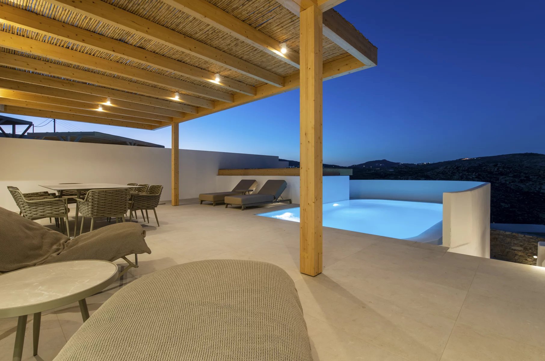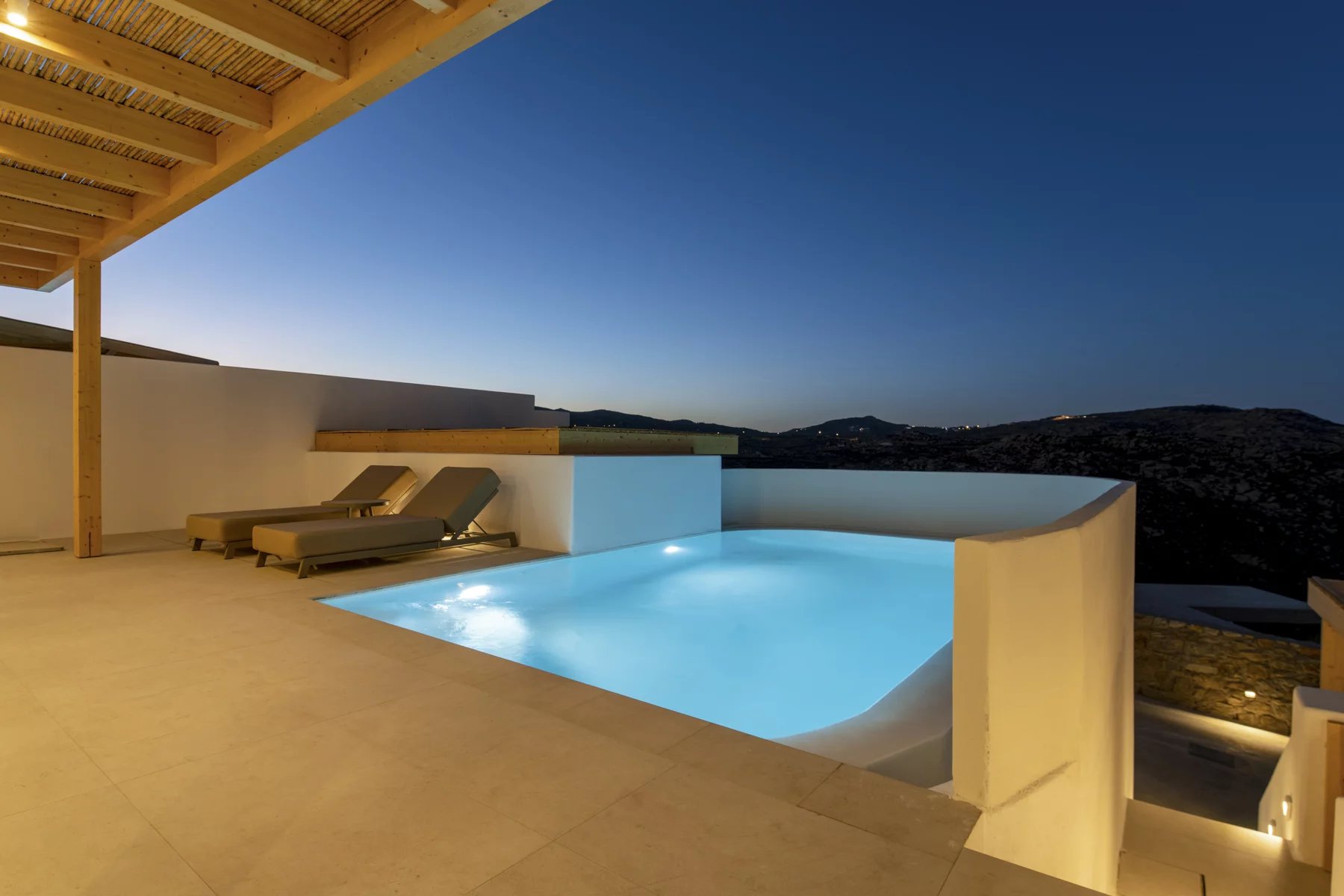 This newly built villa reinterprets Cycladic hospitality, merging contemporary design with traditional warmth. Nestled in a peaceful complex of four villas atop Super Paradise Hill, it features stunning views of the azure sea, all visible from the expansive terrace.