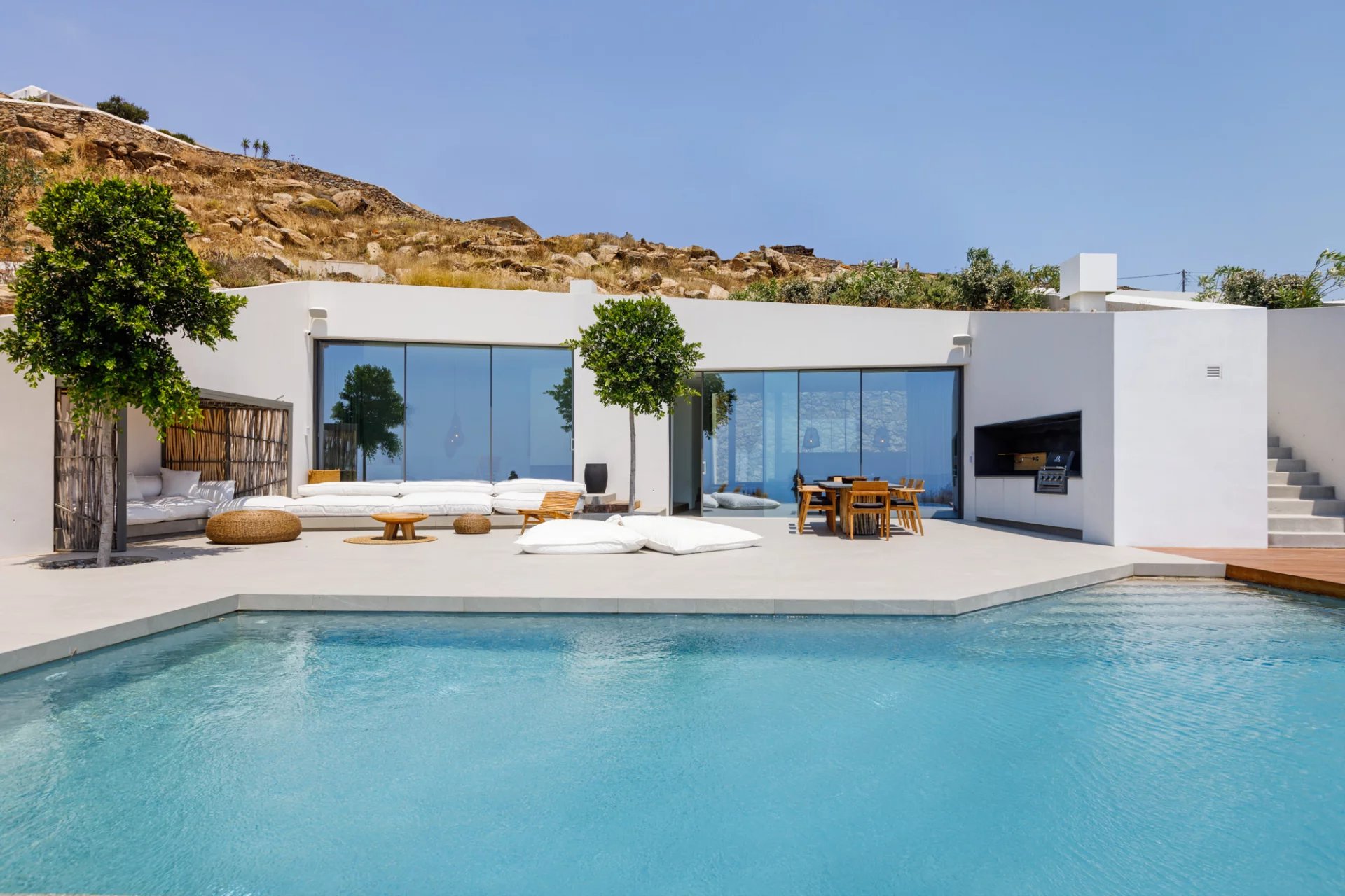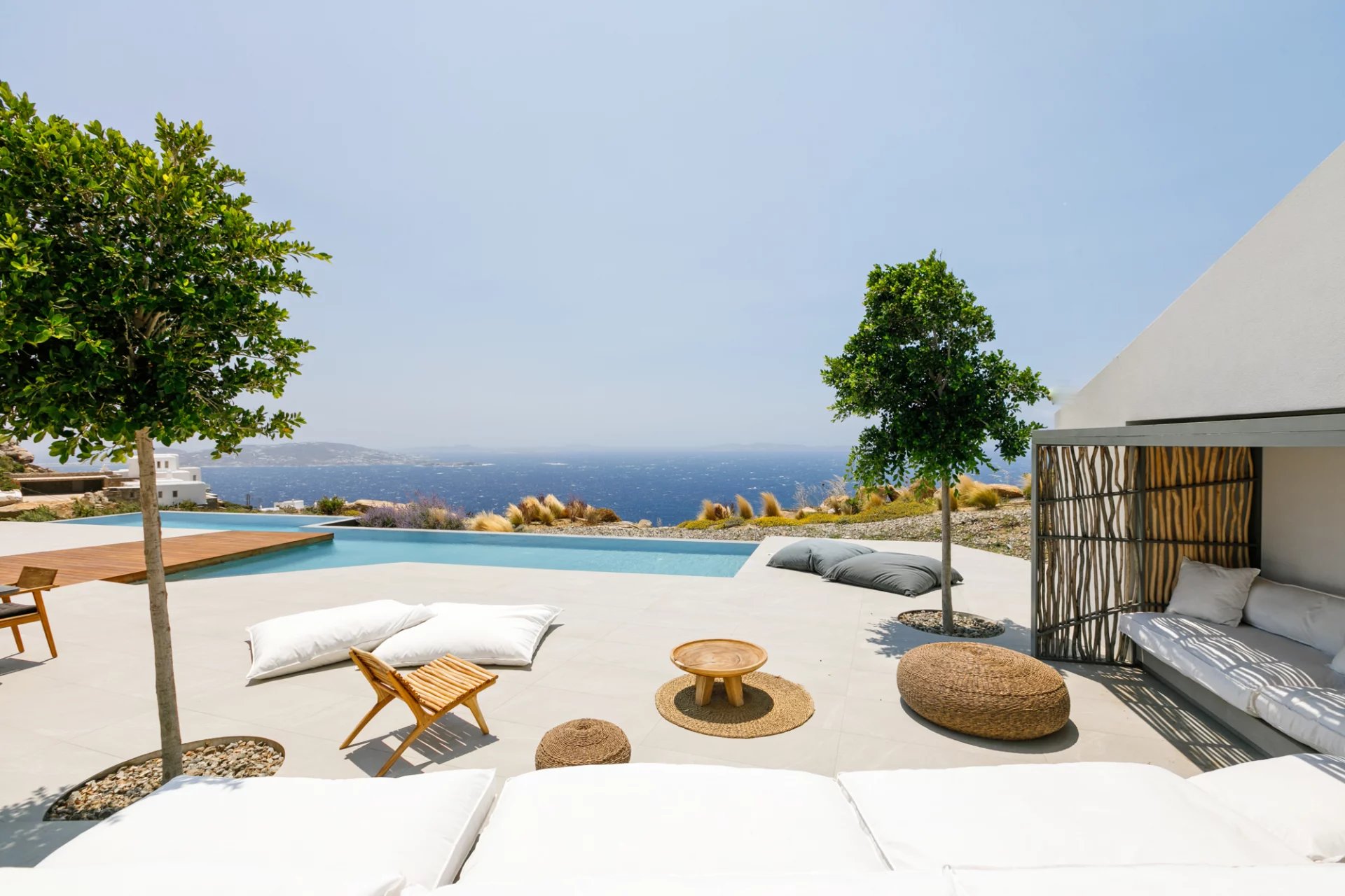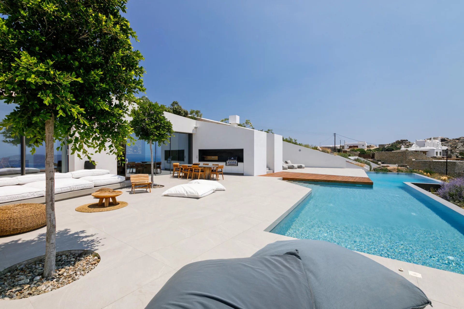 This stunning property, finalised in 2019, has the capacity to comfortably host up to 12 guests. Nestled near the heart of Mykonos (Chora), it enjoys an unusually secluded and tranquil setting in Tourlos, with breathtaking views overlooking Agios Stefanos bay. Thanks to its remarkable design, every room in the villa offers panoramic vistas of the western Aegean Sea and awe-inspiring, unobstructed sunset views. Comprising both the main house and a guest house, this villa features a total of 5 bedrooms, along with an additional assisting bedroom, an independent staff room for in-house staff, and a total of 8 bathrooms. The expansive outdoor deck, spanning approximately 500 square meters, showcases a private Infinity pool measuring 20x4 meters, overlooking the Aegean Sea. This outdoor space also features a dining area, a BBQ area, an open-air Home Cinema, and numerous sitting and lounge areas thoughtfully positioned around the property, providing guests with ample opportunities to relax together or individually.