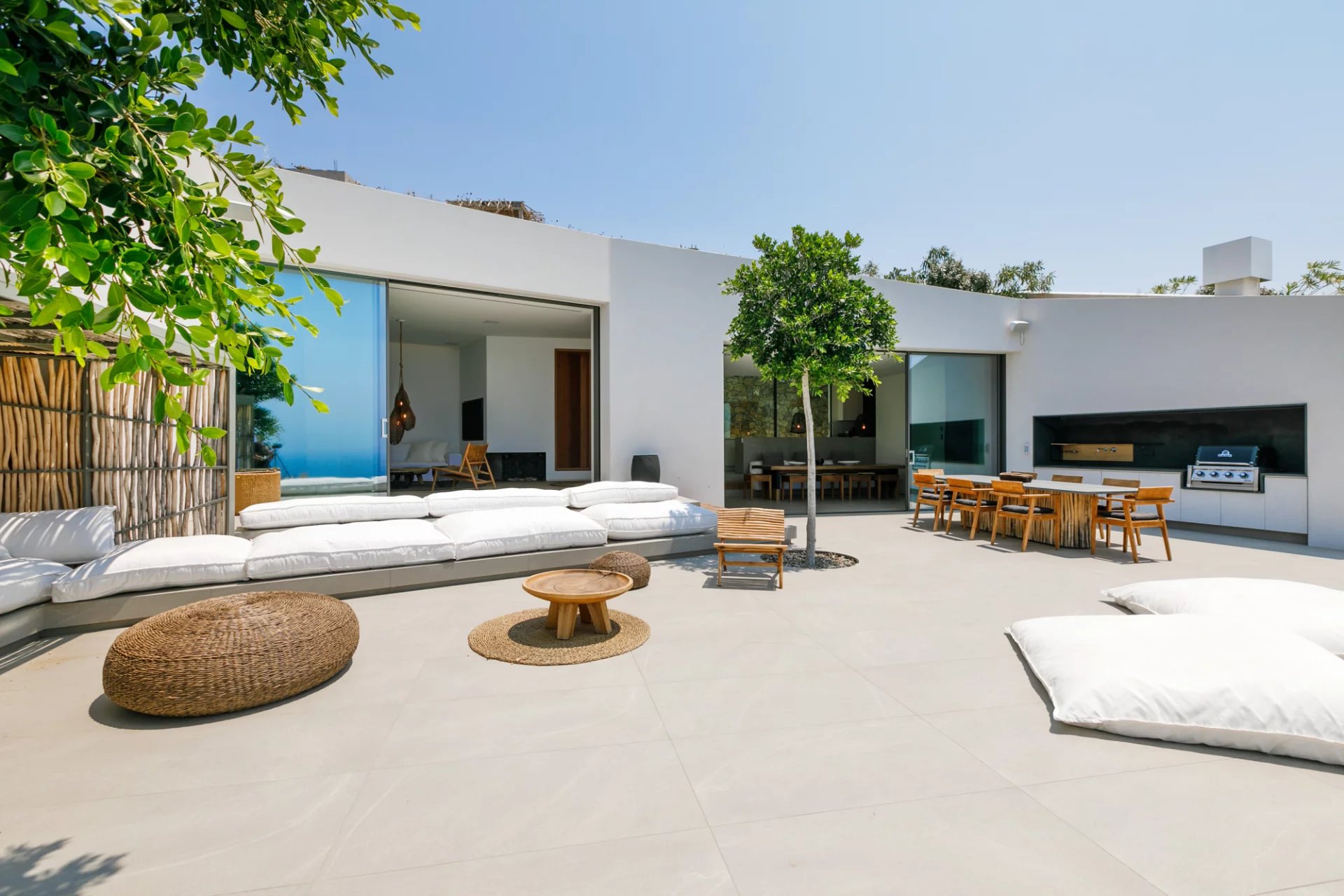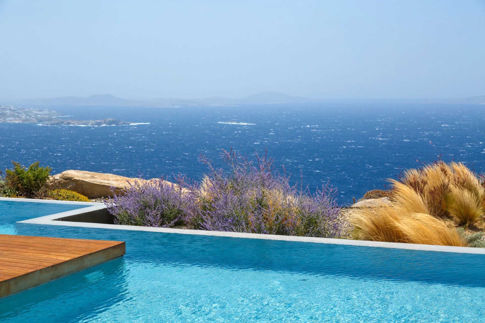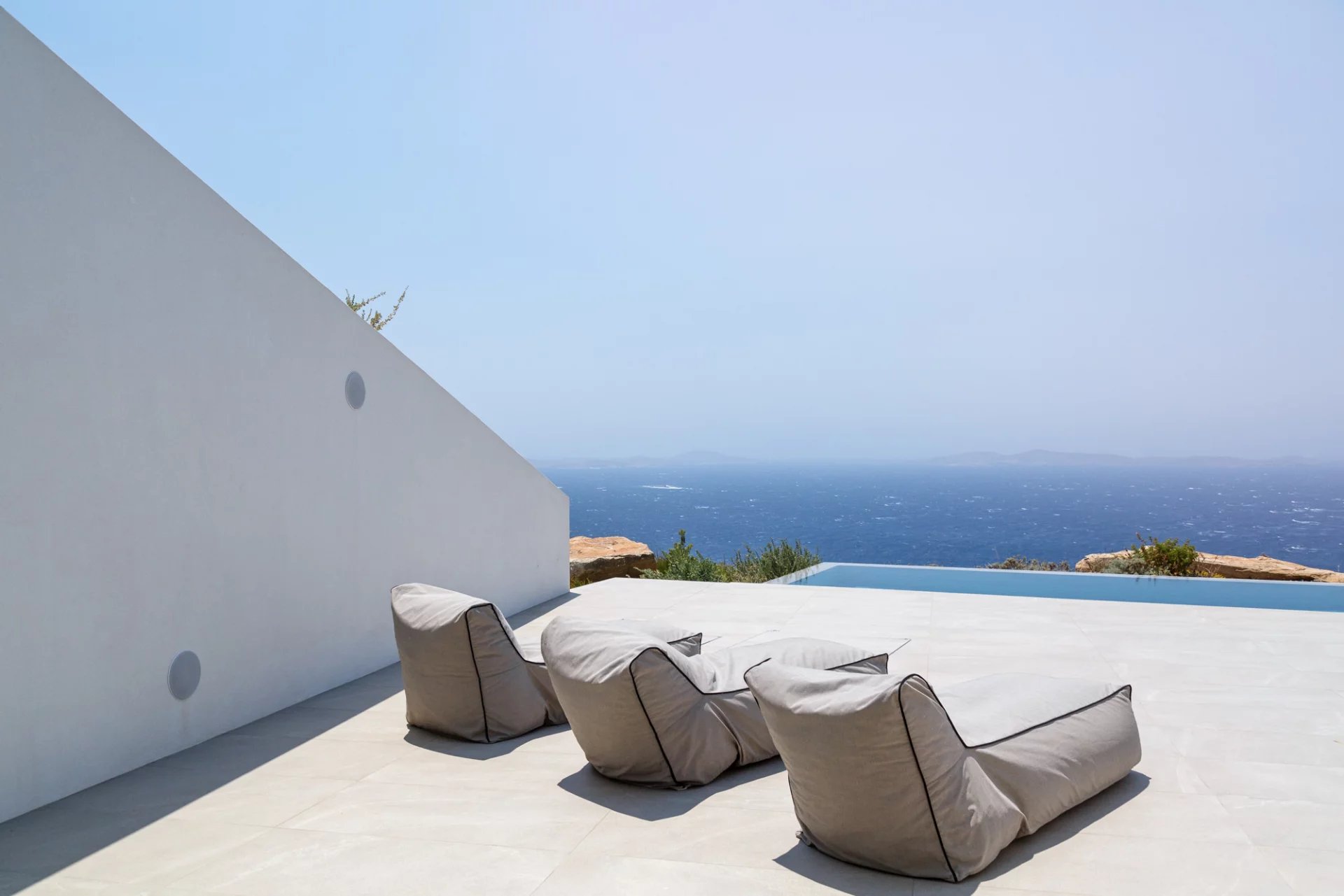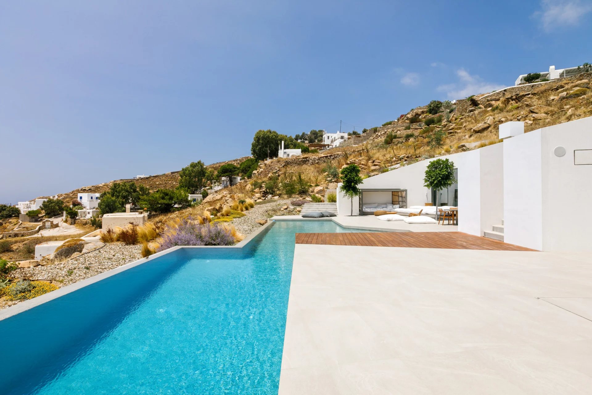 This stunning property, finalised in 2019, has the capacity to comfortably host up to 12 guests. Nestled near the heart of Mykonos (Chora), it enjoys an unusually secluded and tranquil setting in Tourlos, with breathtaking views overlooking Agios Stefanos bay. Thanks to its remarkable design, every room in the villa offers panoramic vistas of the western Aegean Sea and awe-inspiring, unobstructed sunset views. Comprising both the main house and a guest house, this villa features a total of 5 bedrooms, along with an additional assisting bedroom, an independent staff room for in-house staff, and a total of 8 bathrooms. The expansive outdoor deck, spanning approximately 500 square meters, showcases a private Infinity pool measuring 20x4 meters, overlooking the Aegean Sea. This outdoor space also features a dining area, a BBQ area, an open-air Home Cinema, and numerous sitting and lounge areas thoughtfully positioned around the property, providing guests with ample opportunities to relax together or individually.