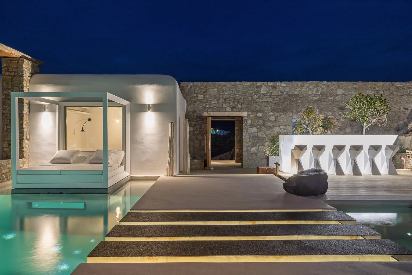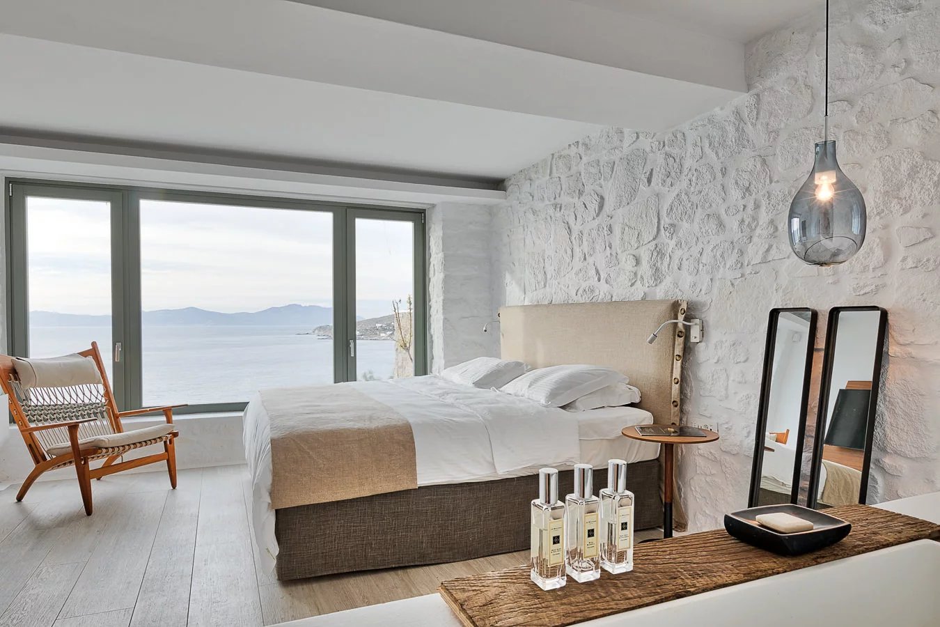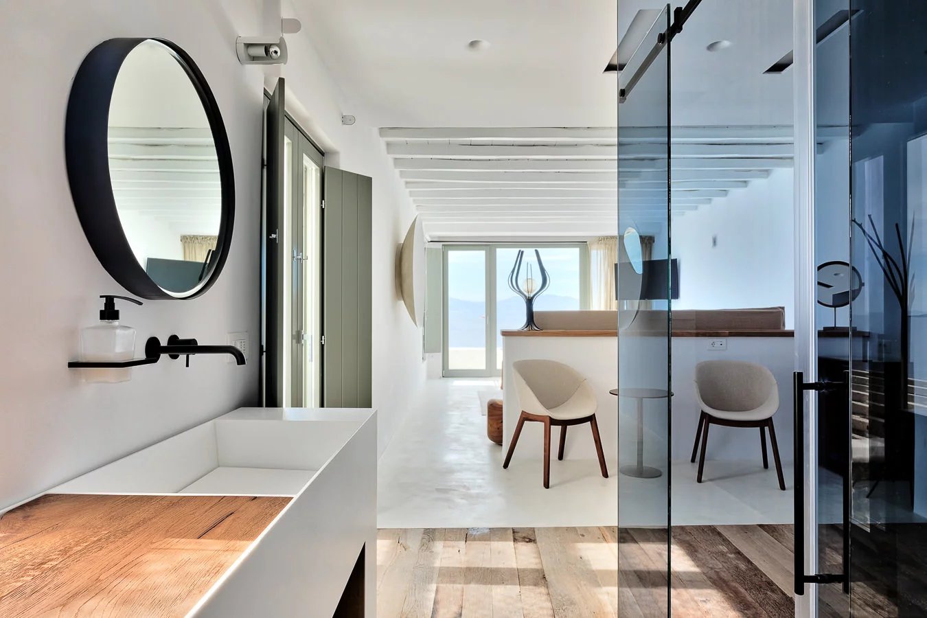 Villa WRV is surrounded by a unique landscape where the sea, rocks and the Cycladic landscape recreate the perfect atmosphere of Mykonos.