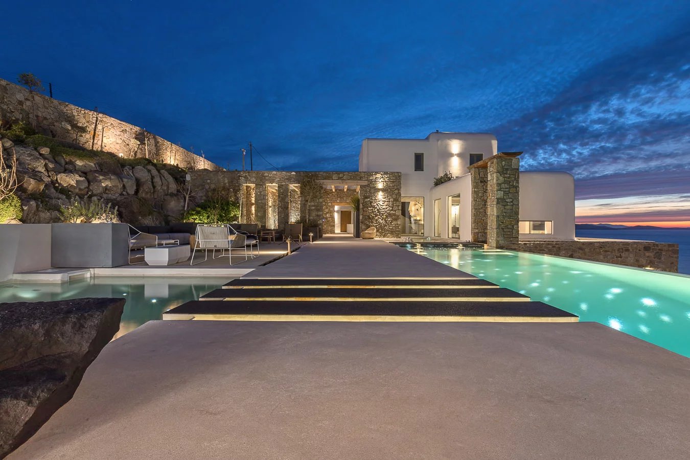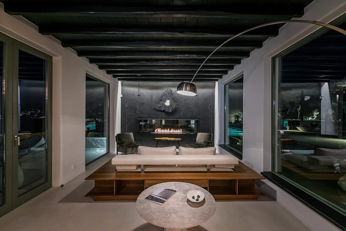 WRV Villa is a modern property designed by a famous architect that offers 10 bedrooms all ensuite and some with their private Jacuzzi,various living rooms,heated swimming pool, Jacuzzis and located within a short distance from Mykonos town and south beaches.