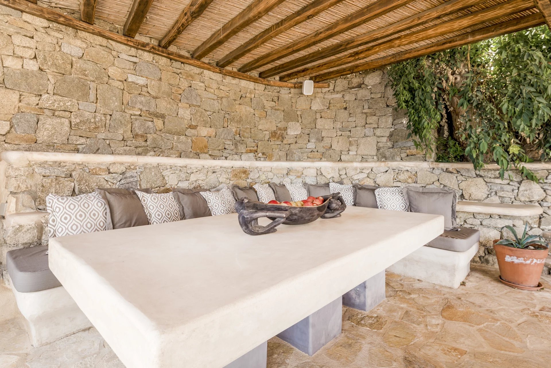 Outdoor shaded dining table with built-in sofa