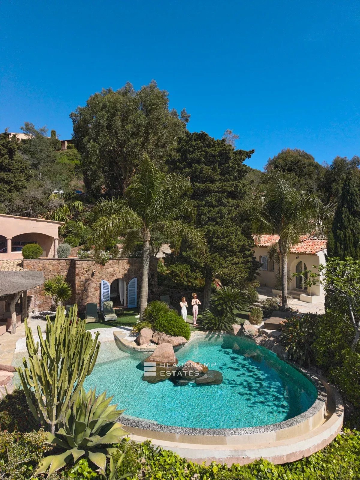 Outdoors, the heated swimming pool is set within a tropical ambiance and invites relaxation with its expansive terrace. Nearby, the pool house with a summer kitchen creates the perfect setting for convivial moments in a refined environment. At this level, a fifth suite completes the property, ideal for teenagers or additional guests.