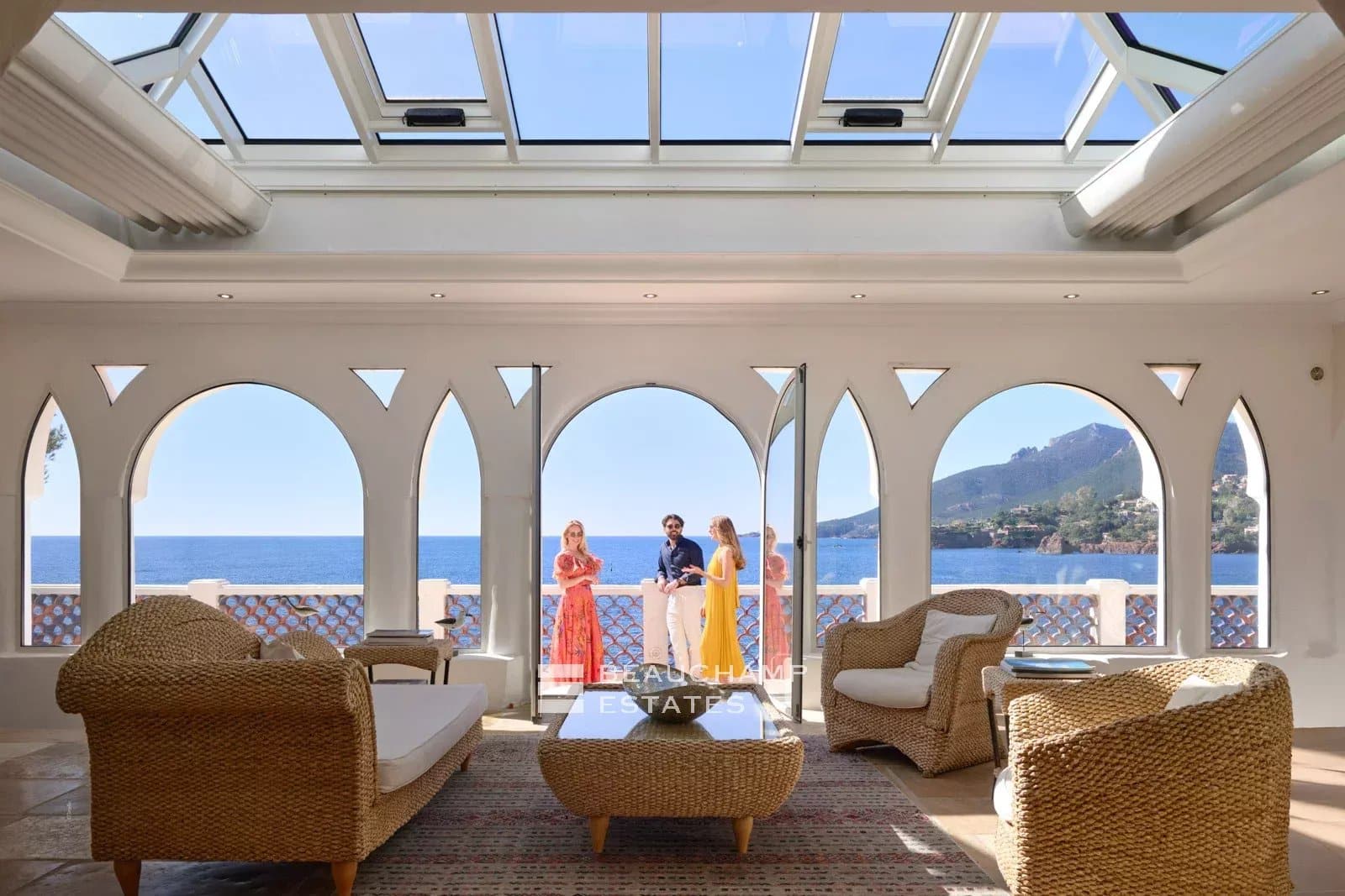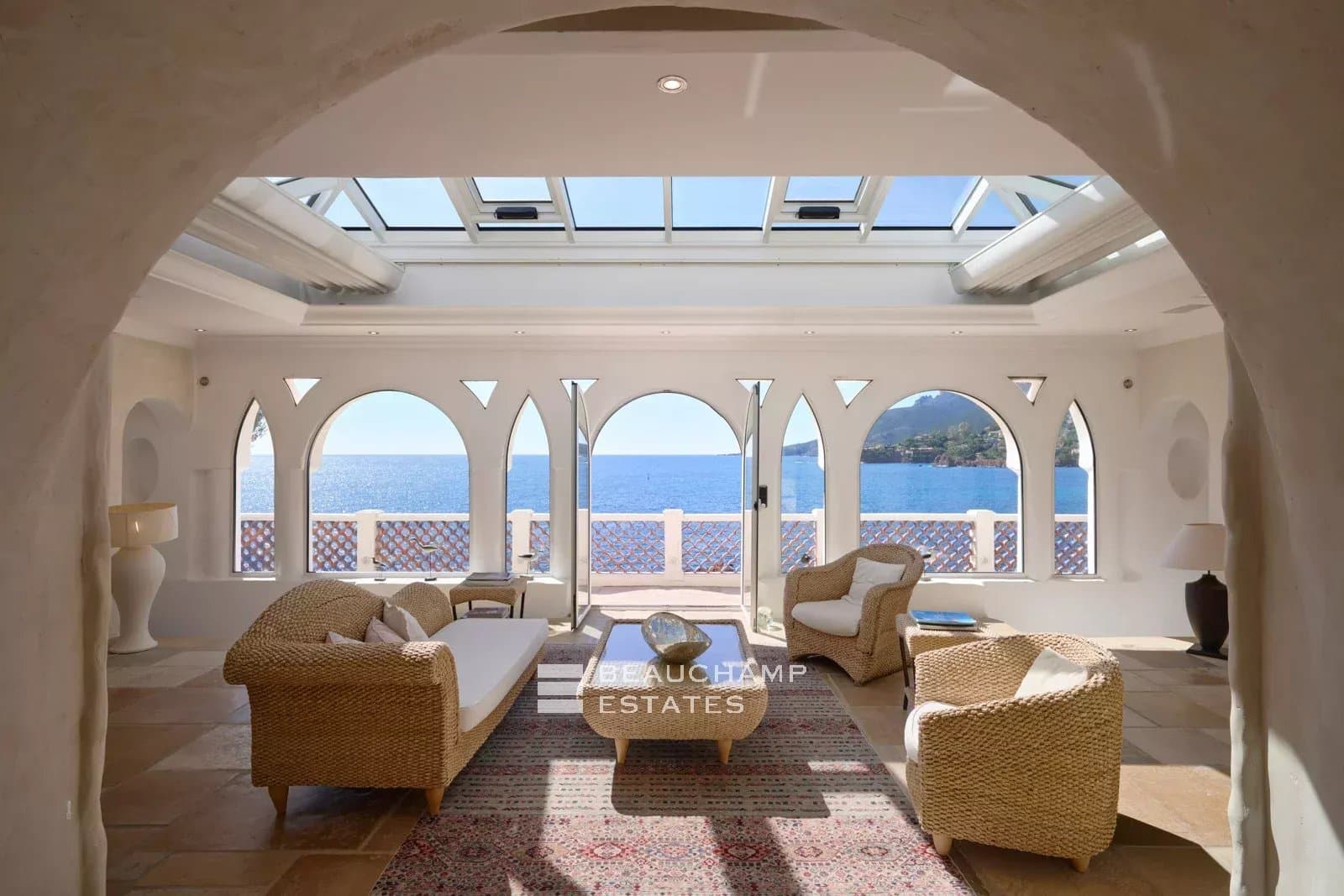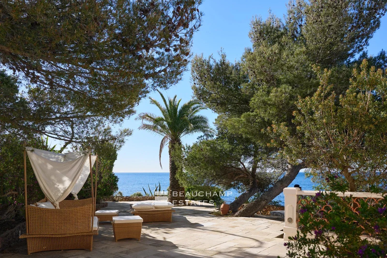 A sea-facing terrace, fitted with sun loungers, reveals breathtaking views over the Mediterranean, offering a privileged setting at any time of day.