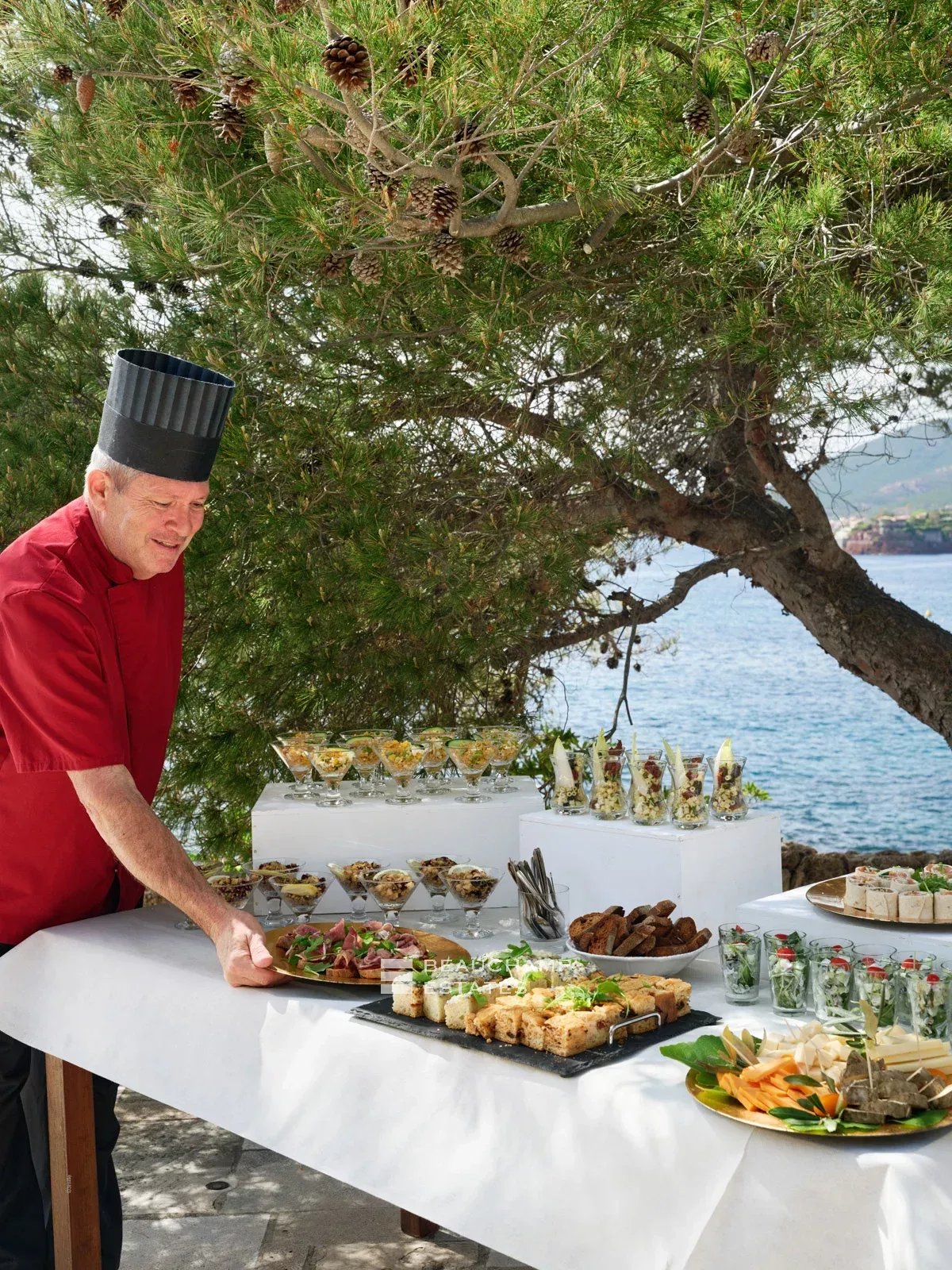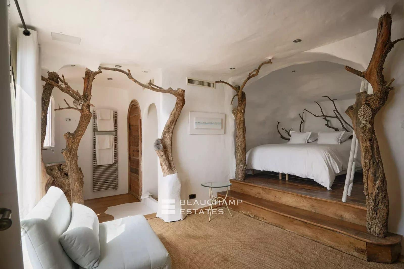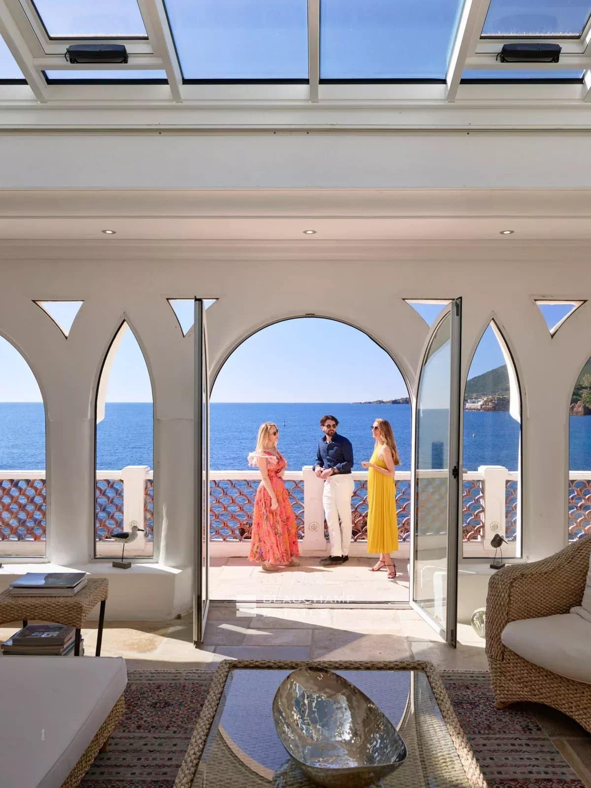 A sea-facing terrace, fitted with sun loungers, reveals breathtaking views over the Mediterranean, offering a privileged setting at any time of day.
