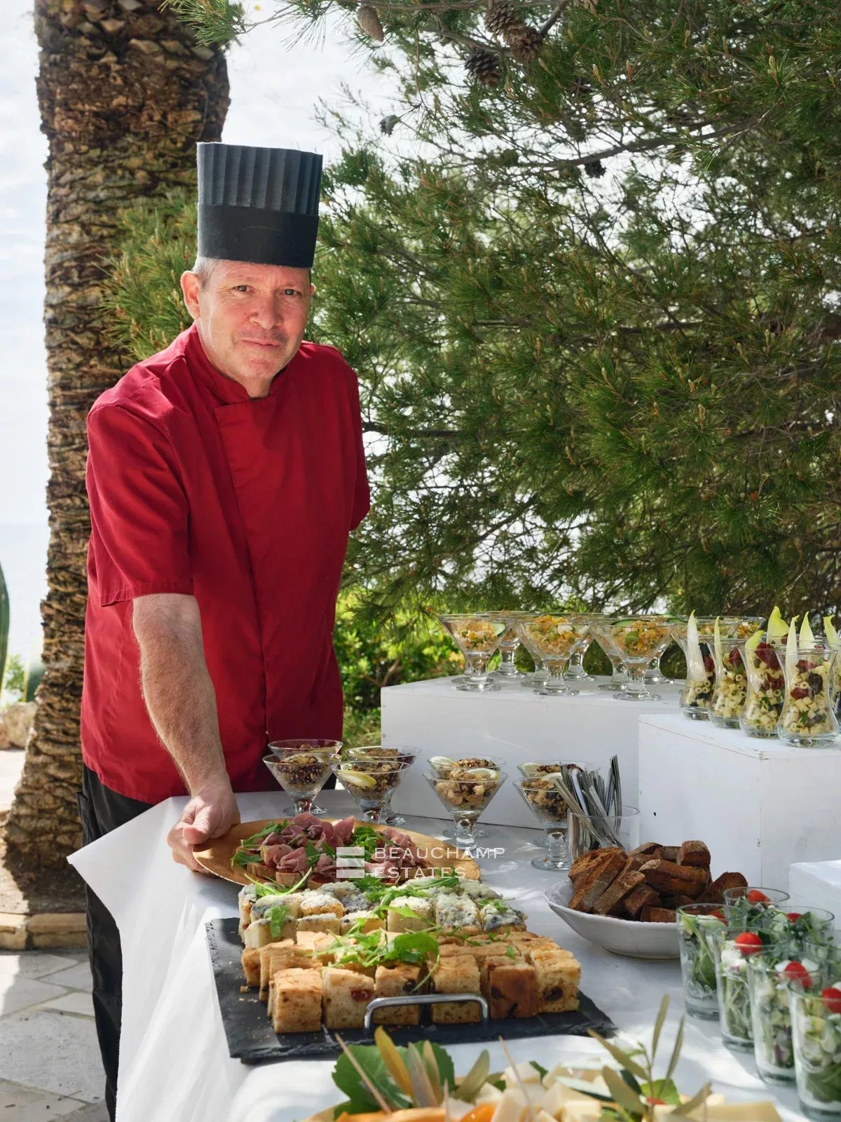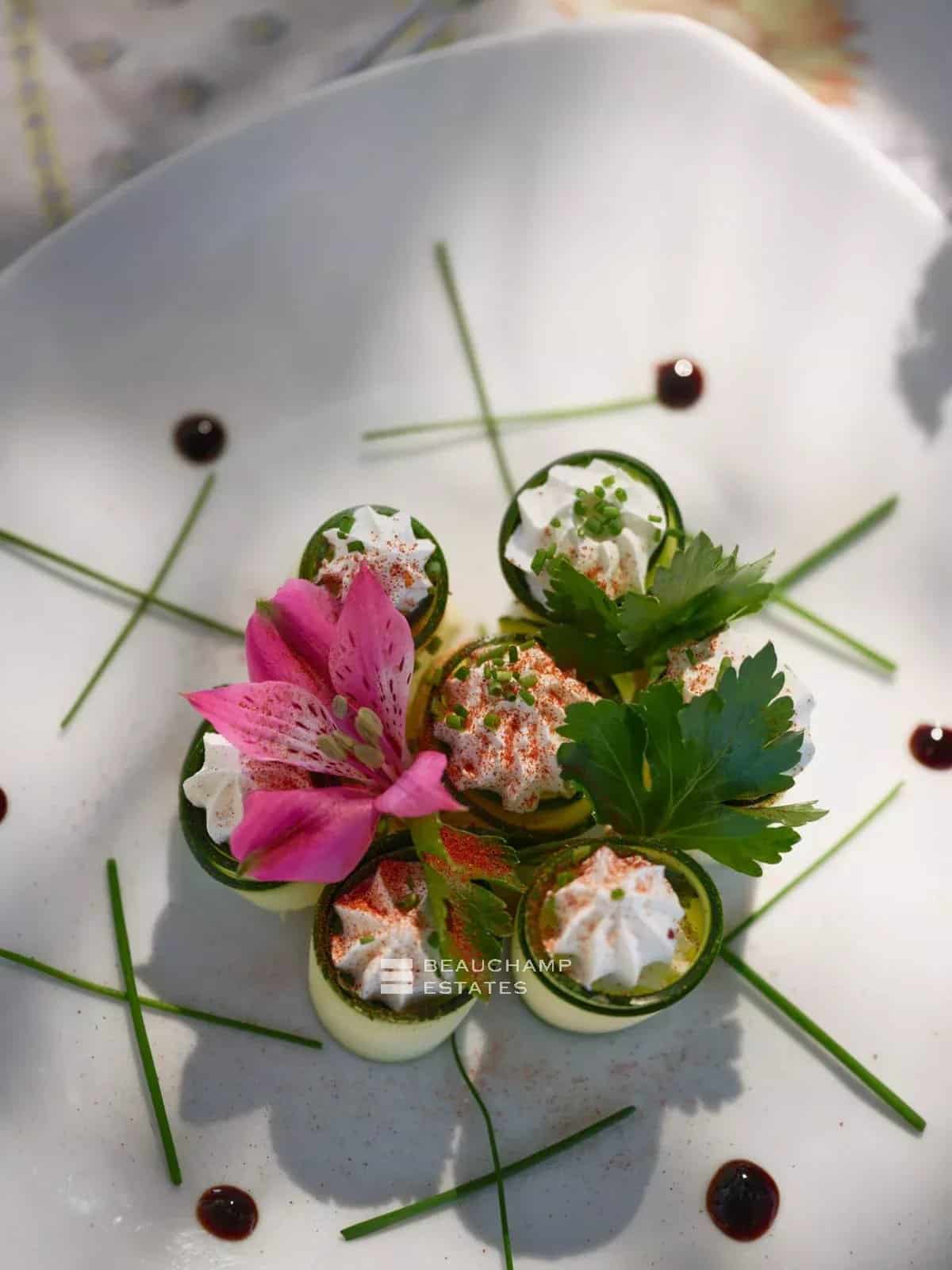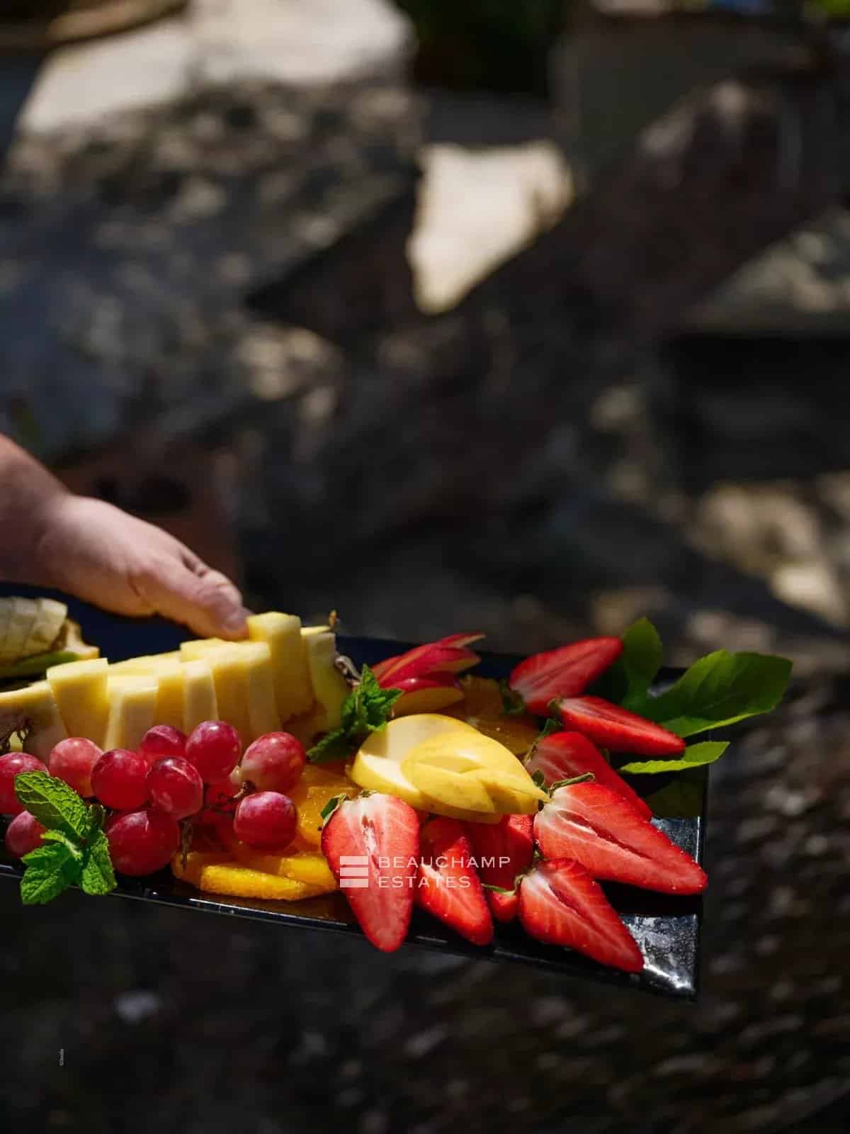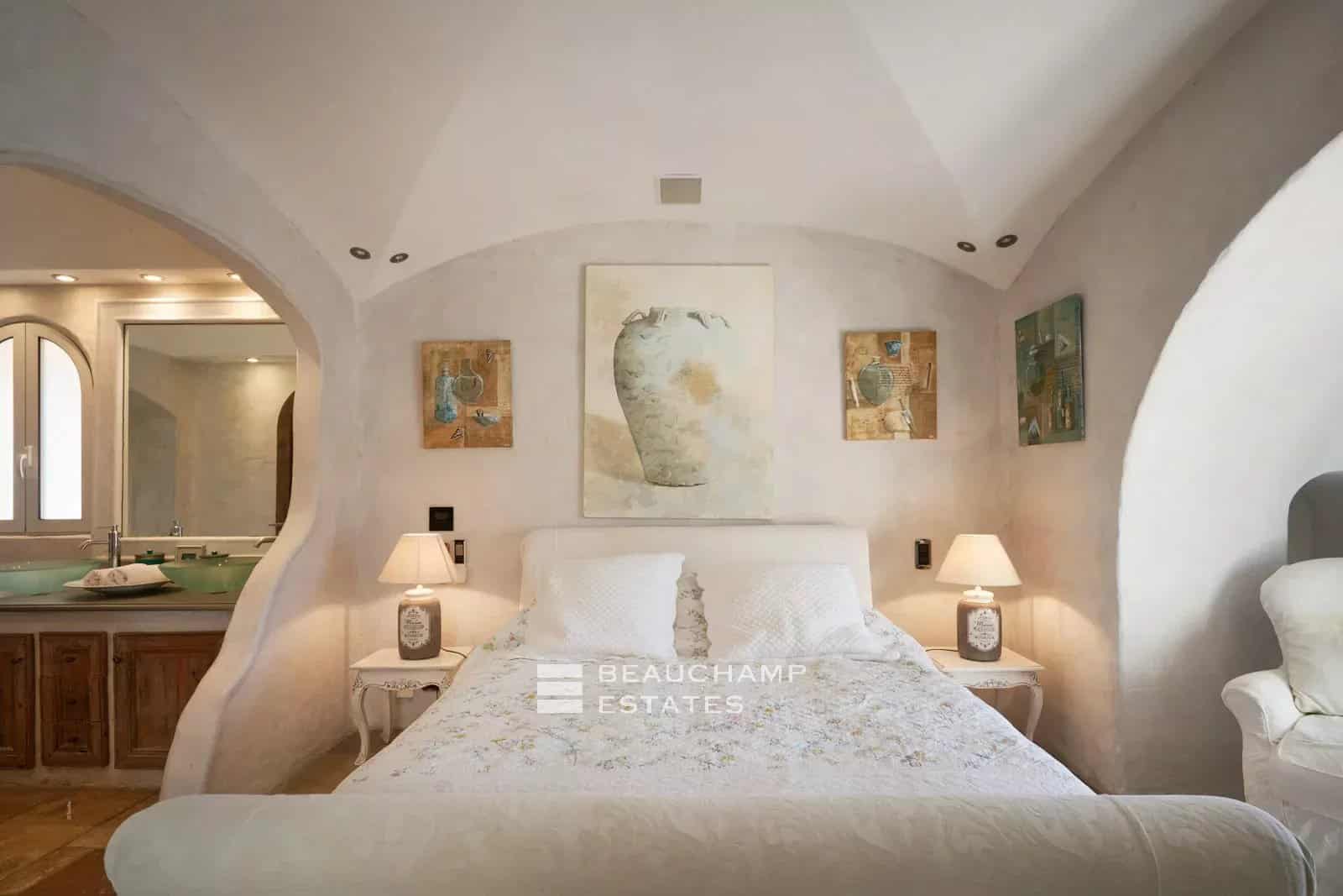 The main villa features a bright double living room and a spacious dining kitchen, designed for entertaining in a refined yet welcoming atmosphere. Opening onto several landscaped terraces, the living areas flow seamlessly outdoors, with a teak dining table, barbecue area, and facilities allowing for year-round enjoyment.